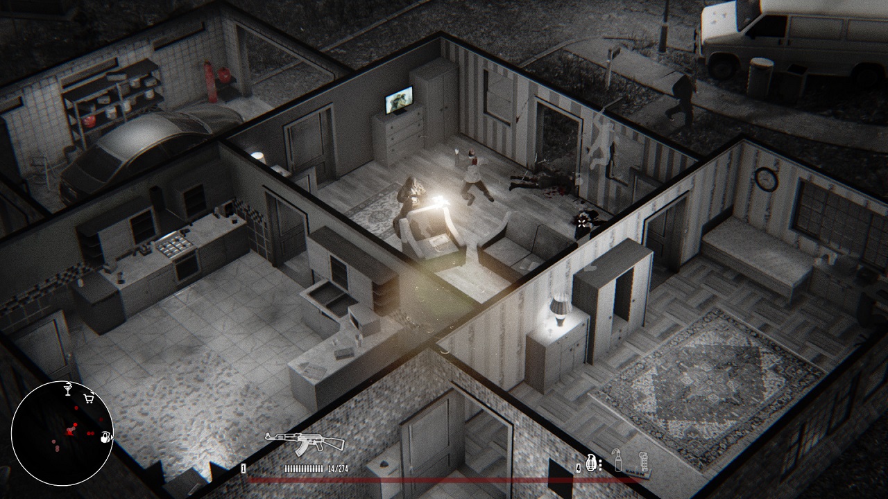 Итак, суть игры заключается в беспорядочном убийстве всех людей вокруг, вы будете убивать как гражданских лиц, так и полицейских, а позже и военных. Вы можете использовать людей как живые щиты, враги, стреляя по вам, будут попадать в невинную жертву. Игра дает возможность полностью насладиться кровищей, разрешением и убийствами. Очень хорошо передана атмосферность, мрачные коридоры, темные здания, вид сверху. Черно-белые мотивы отлично передают атмосферу «Города грехов», отлично чувствуется напряжение и холодное спокойствие, с которым главный герой совершает свои злодеяния. Вы почувствуете себя прямо там, рядом с главным персонажем, в этом поможет отличное музыкальное оформление. Прохождение игры довольно сложное, придется думать и попотеть в некоторых моментах.