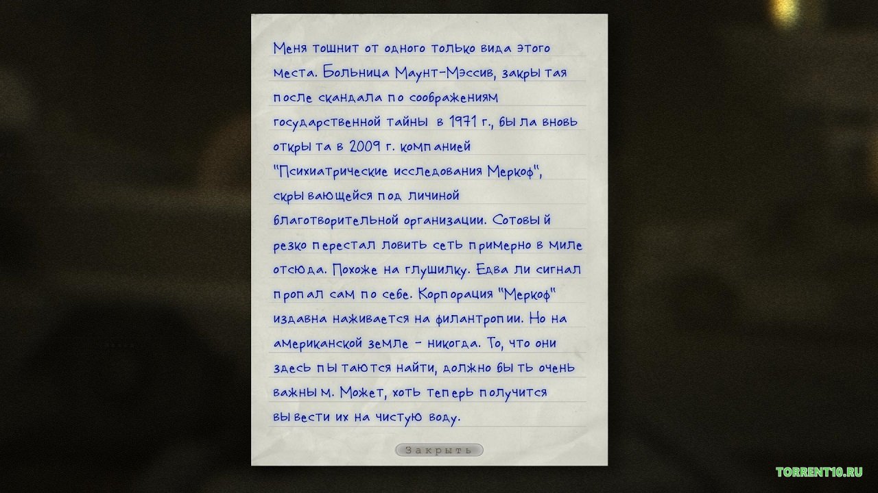 - Найти выход. Попав в лечебницу, вы поймете, что все входы и выходы заблокированы, нет никакой охраны, и теперь вам в одиночку предстоит выполнять свои игровые расследования.