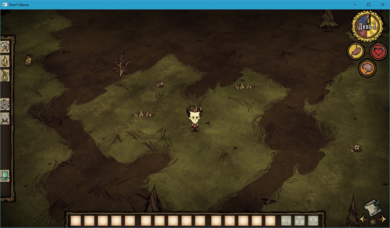 Итак, вернемся к глобальной цели в игре, нам нужно вернуться в родной мир. Это никак не стимулируется извне и никак не поощряется. Нам просто нужно выжить, но чем дольше мы пробудем в этом мире, тем сложнее выживать. Так что нужно вовремя обеспечить себе выполнение главной цели. У нас есть только две задачи помимо основной – не остаться без света на ночь и обеспечить еду своему персонажу. Уилсон может прожить без еды всего два дня, потом он умрет от голода.