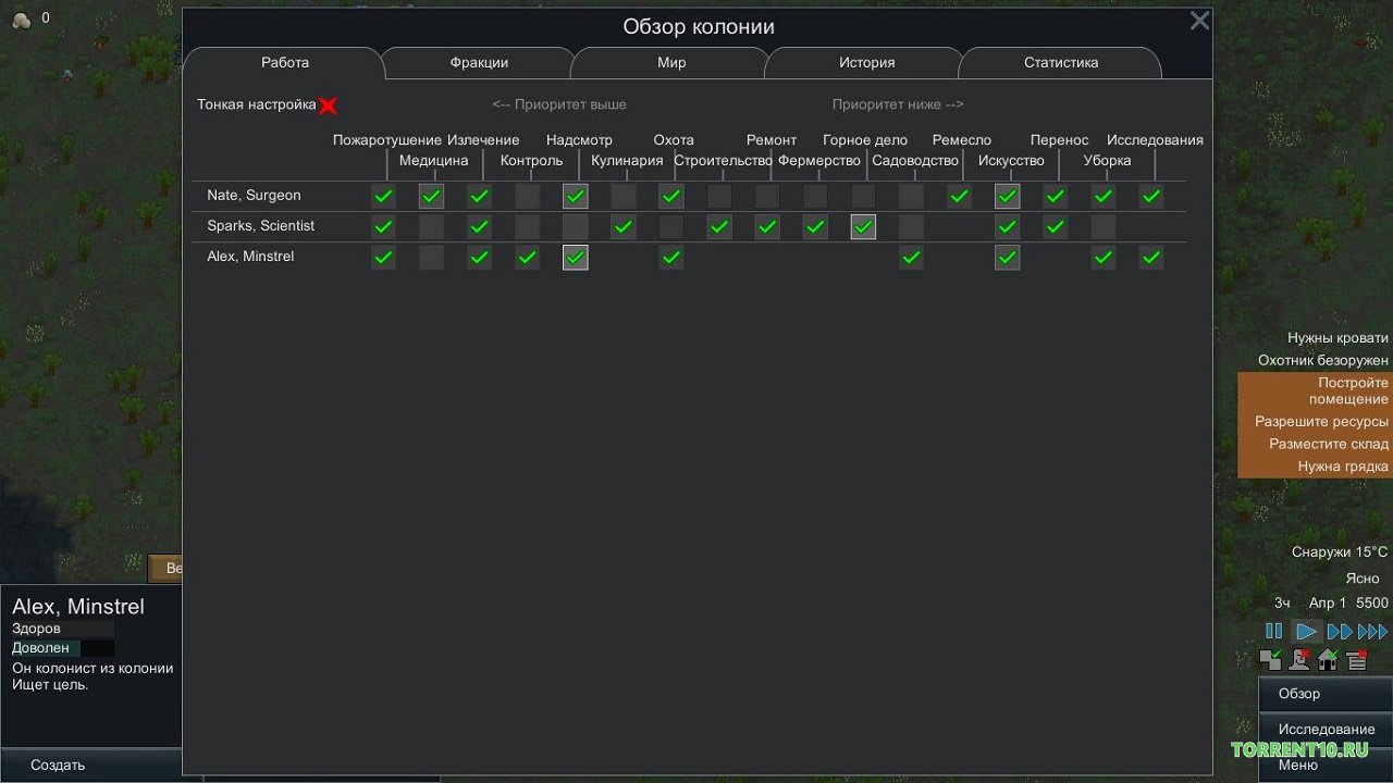 Придется самостоятельно создать для персонажей игровые задания и тогда можно достичь успеха. В процессе игры придется испытывать нехватку ресурсов и колонистов. После того как игрок успешно покинет планету, то тогда игровая миссия будет выполнена. В игре есть много чего интересного, поэтому у игроков не будет времени на то, чтобы скучать. Помимо того, интересные персонажи могут порадовать любого игрока в независимости от того какой он предпочитает жанр. Стоит Римворлд Роялти скачать торрент, чтобы иметь возможность лично оценить проект. Каждый игрок сможет получить море эмоций, а также удовольствия от игрового процесса, поэтому не стоит медлить со скачиванием игры. Игра обладает следующими особенностями: