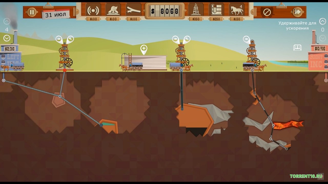 Стать нефтяным монополистом предлагает вам новая аркадная стратегия. События игры навеяны лихорадкой, виной которой стала нефть. Так что приготовьтесь отправиться в девятнадцатое столетие в Северную Америку, чтобы там добывать ценный продукт, который впоследствии можно будет продавать на черном рынке. Чтобы стать успешным магнатом такого бизнеса, в первую очередь вы должны взять в аренду участки земли, чтобы там начать добывать нефть. Естественно вам потребуется рабочая сила. Нанимать вы будете бурильщиков, которым необходимо будет построить жилые дома. В игре Turmoil, скачать торрент на русском которой возможно совершенно бесплатно, если вы посетите наш сайт, вам предстоит развивать свои нефтяные наделы. Но чтобы добывать нефть, вам нужны бурильные установки, вам придется рыть скважины. Найдя правильный участок, можно там установить вышку и добывать нефть. Вы также сможете посещать аукционы, чтобы там покупать акции у своих конкурентов. Как видите, чтобы добиться своего, вам нужно постараться не только продавать нефть, но еще и построить хранилища. Такой ценный продукт всегда востребован, особенно во времена нефтяной лихорадки. Очень увлекательная стратегия, версия которой уже успешно переведена на русский язык!